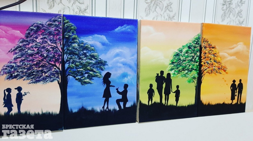 Несмотря на то, что Юлия – начинающий художник, у нее уже появились первые почитатели. «Вот эта серия картинок писалась под заказ, это уже продано», – показывает Юля на полиптих с общим названием «Маленькая история большой любви».