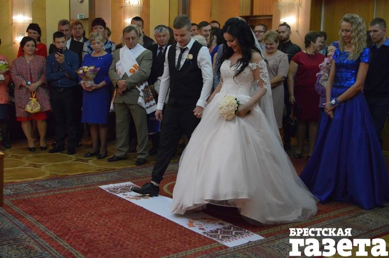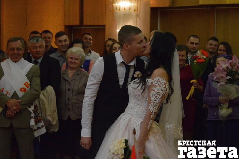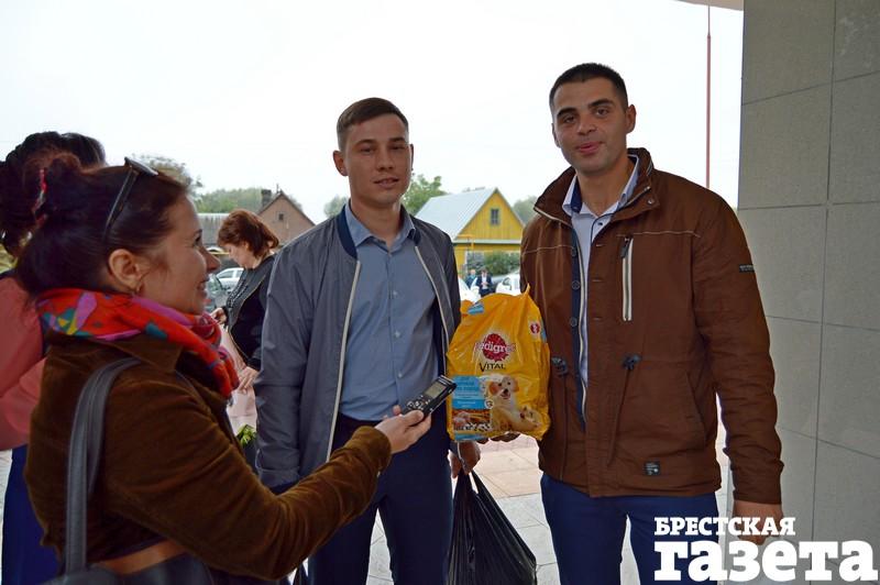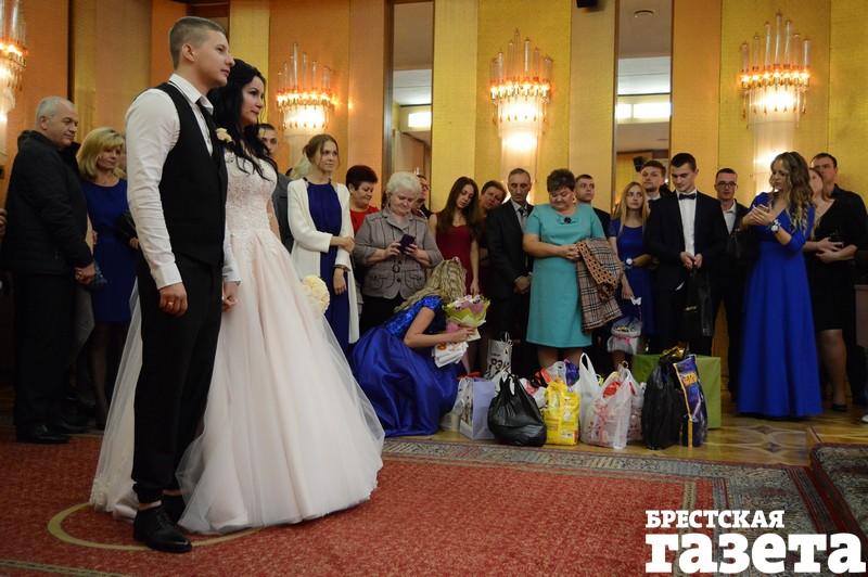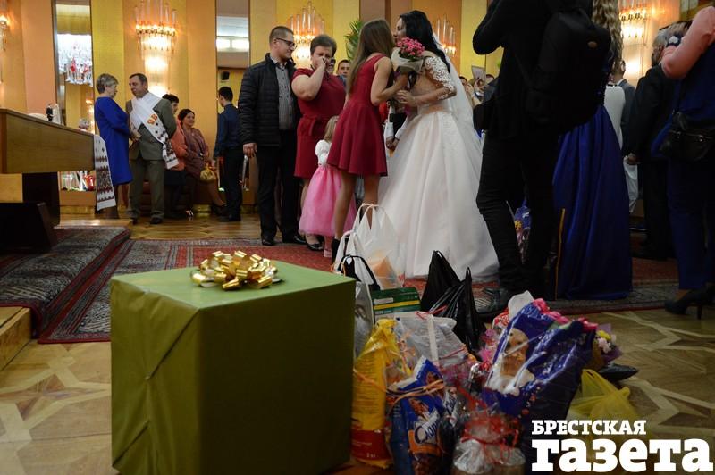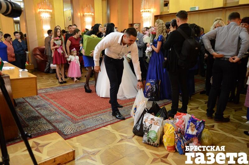 В пятницу 22 сентября в Доме гражданских обрядов в Бресте состоялось бракосочетание Екатерины Василюк и Александра Ажаева. Многие гости принесли в ЗАГС корм для котов и собак. Не обошлось и без цветов. Были гости, которые несли и корм, и букет.