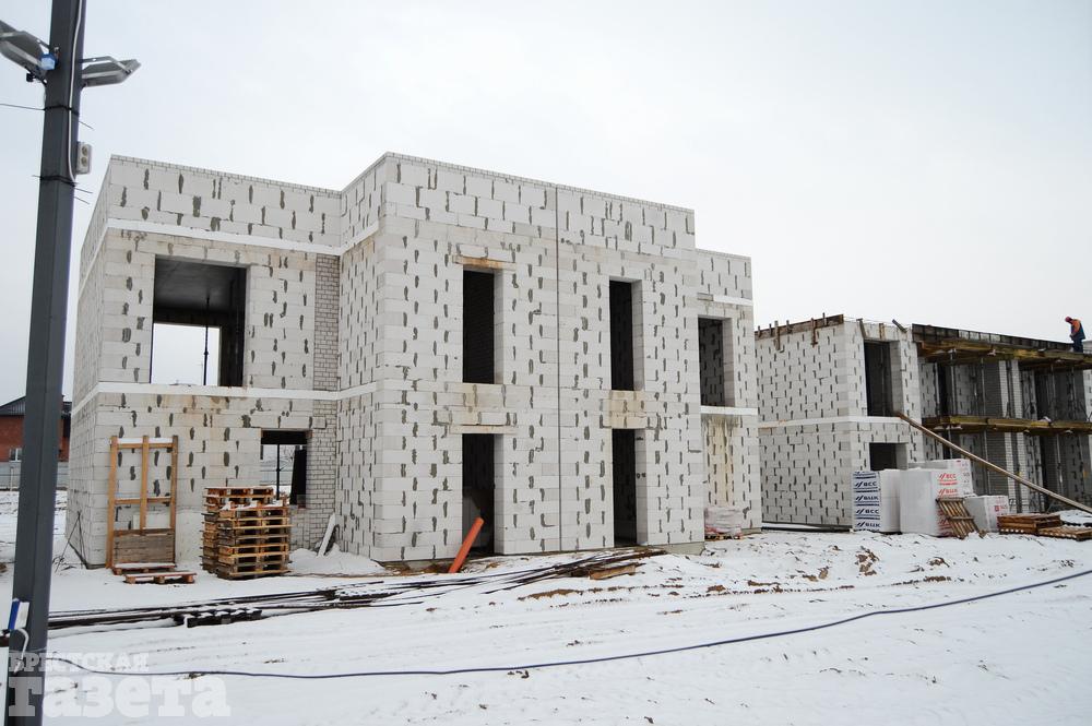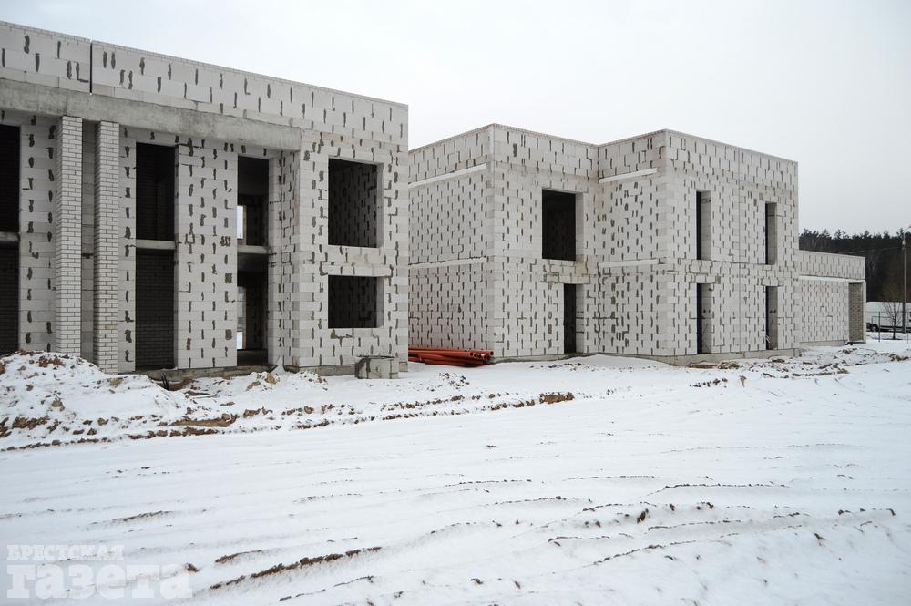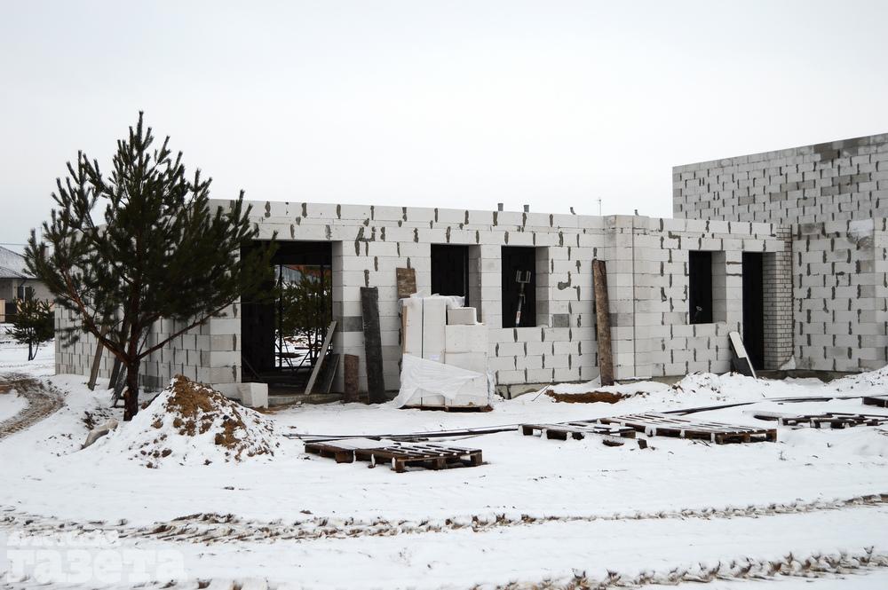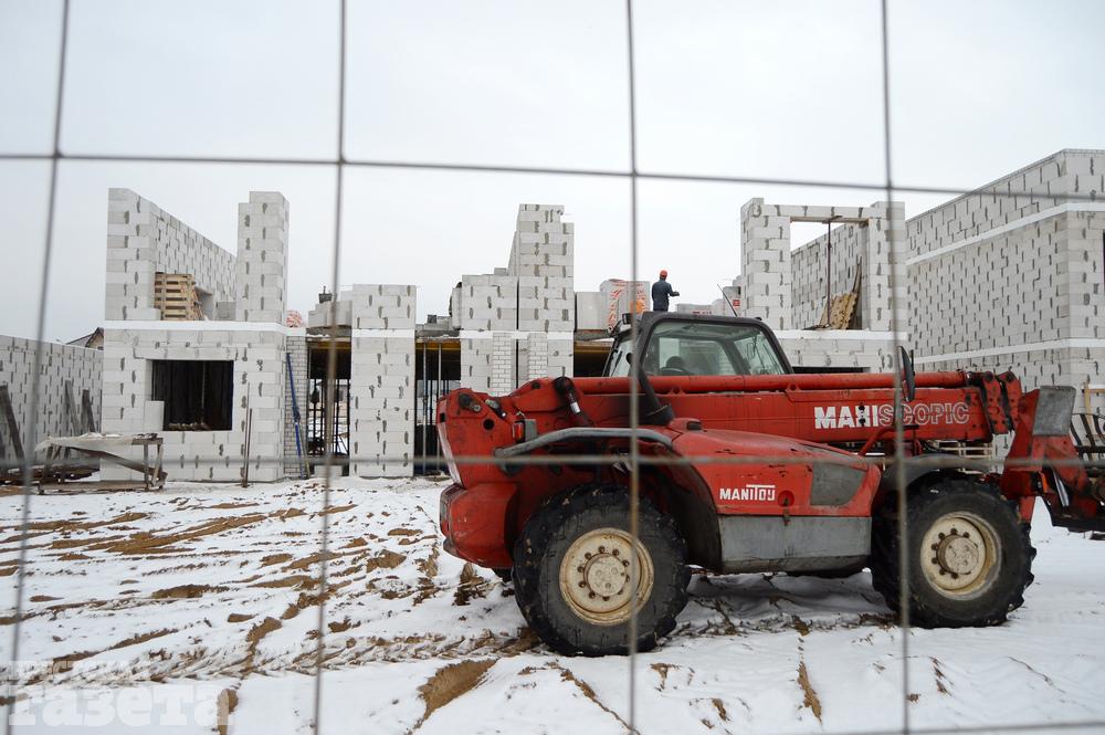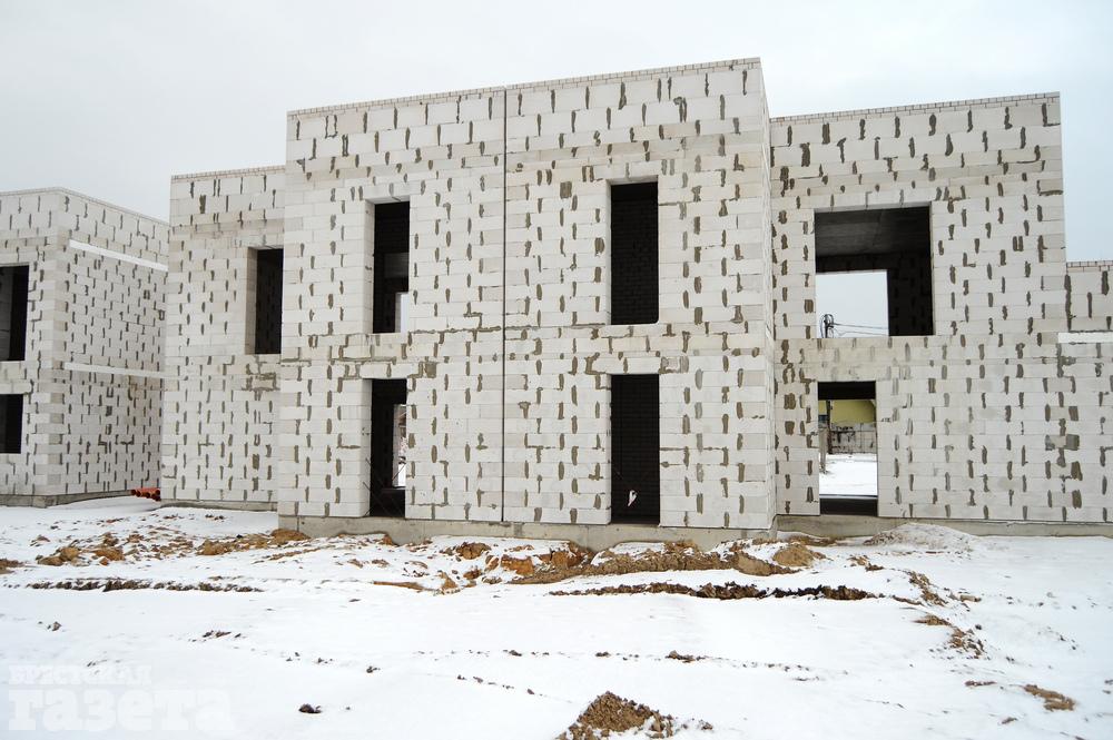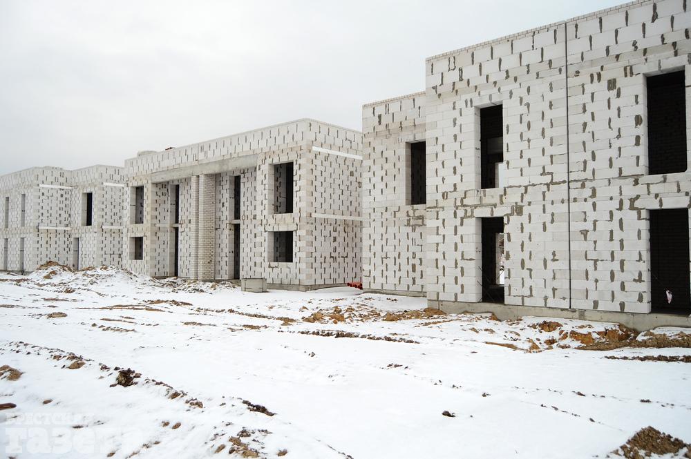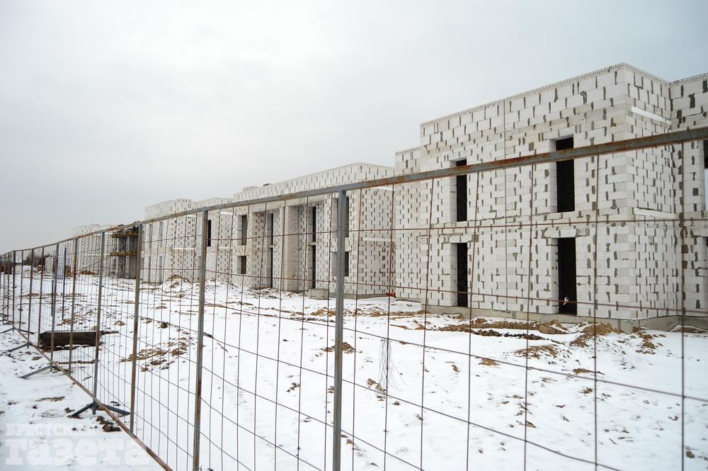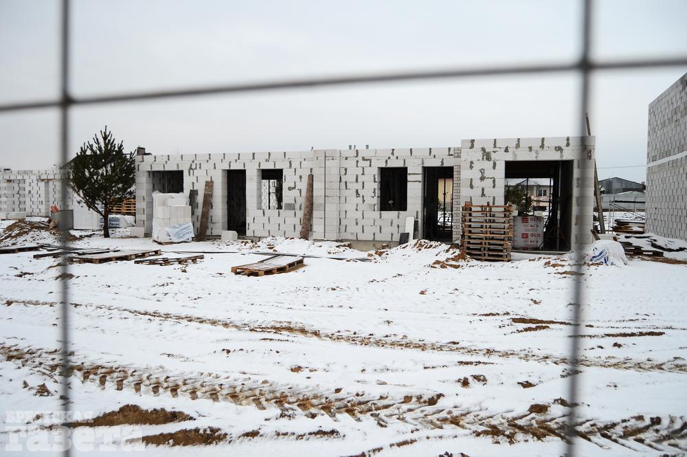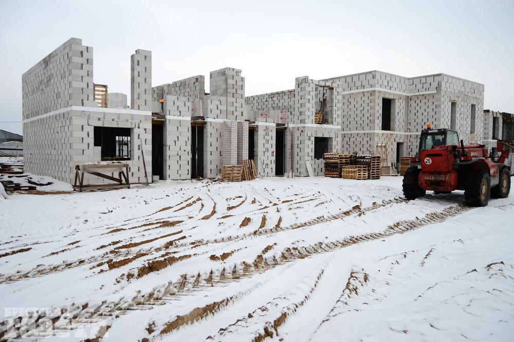 Утром 12 марта работа там кипела. За девять месяцев, что идет стройка, почти успели возвести коробки шести домов, на очереди еще один — уже залит его фундамент.