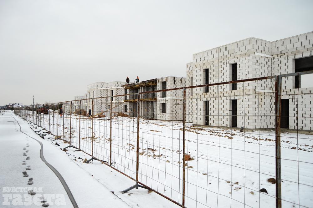 На улице Вересковой в Бресте полным ходом идет строительство «Скандинавского предместья» — нового квартала таунхаусов в микрорайоне Плоска между улицами Калиновая и 10-я Вересковая.