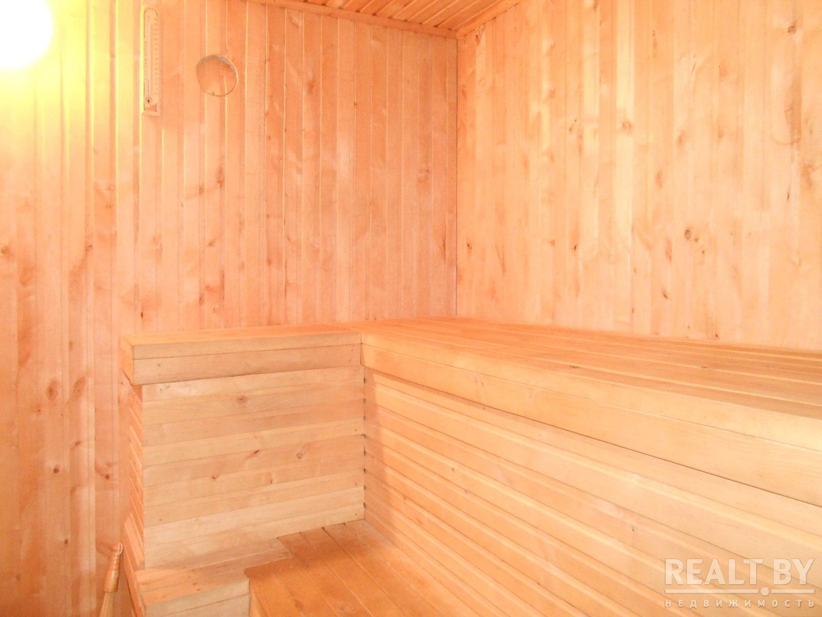 Из «плюшек» — баня, беседка с барбекю, встроенный гараж на два авто, двойной гараж с комнатой отдыха, ворота с электроприводом и система охранной сигнализации.
