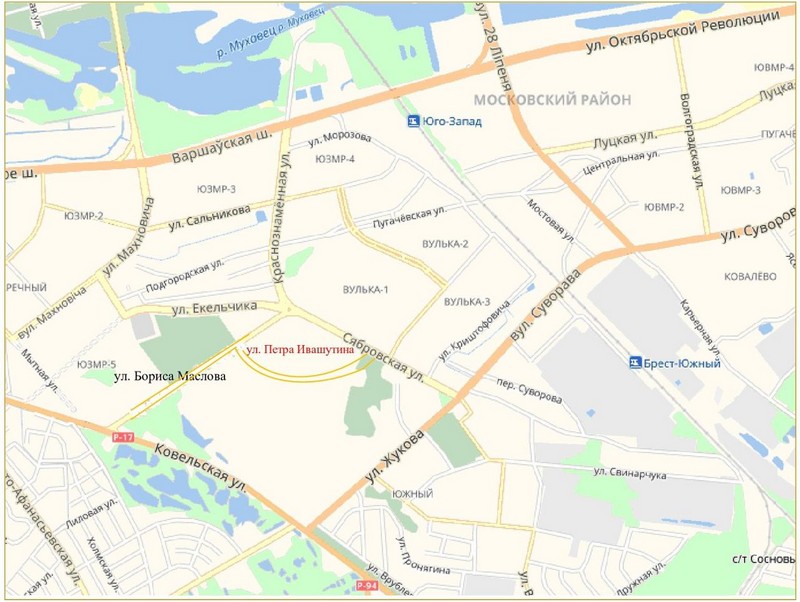 Карта Бреста с местом, где может появиться улица Ивашутина. Фото: Брестский горисполком