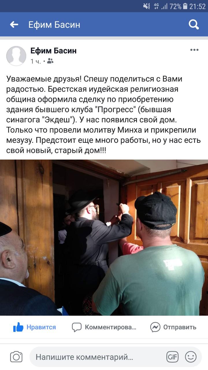 «У нас появился дом!»,написал на своей странице в Facebook исполнительный директор Брестского еврейского благотворительного центра «Хэсэд-Давид», краевед Ефим Басин.