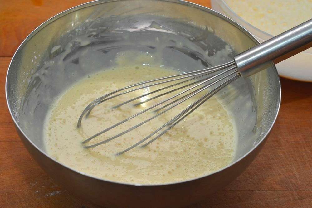 В отдельной емкости взбейте молоко и яйца. Вылейте половину молочной смеси в муку. Хорошо перемешайте до однородности. Добавьте охлажденное масло. Снова перемешайте. Введите оставшуюся молочную смесь и взбейте венчиком.