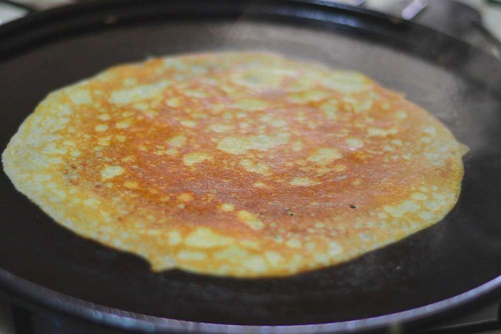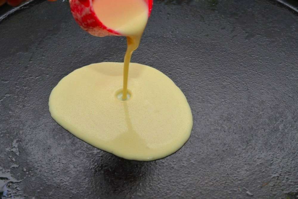 Нагрейте сковороду на среднем огне и сбрызните ее маслом. Вылейте на сковороду 1/4 ст. молочной смеси. Равномерно распределите тесто по сковороде. Выпекайте блинчик с этой стороны примерно 25 секунд. Как только края блинчика начнут коричневеть, быстро переверните блин с помощью лопатки.