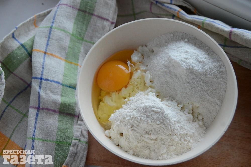 Готовим: В миску положите творог, рисовую и пшеничную муку и 1 яйцо.