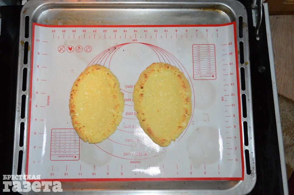 Разделите творожное тесто пополам, слепите продолговатые котлетки и положите их на противень, застланный силиконовым ковриком.