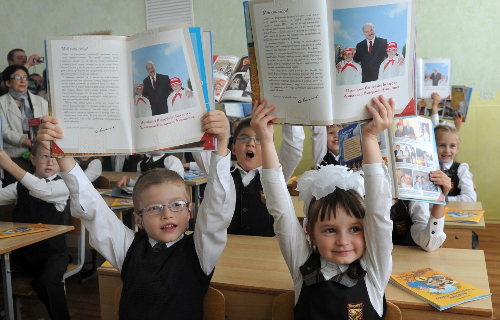 Первоклассники показывают книгу об Александре Лукашенко на одном из первых уроков в школе