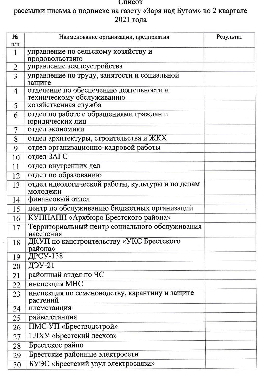 Эту часть цитируем полностью: «В целях активизации работы по распространению информации о деятельности органов исполнительной и распорядительной власти, экономической и социально-политической жизни трудовых коллективов предприятий, организаций и жителей района предлагаем организовать индивидуальную подписку на районную газету «Заря над Бугом» на второй квартал 2021 года».