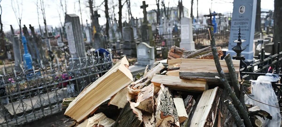 Срубленные деревья и дрова на Тришинском кладбище в Бресте