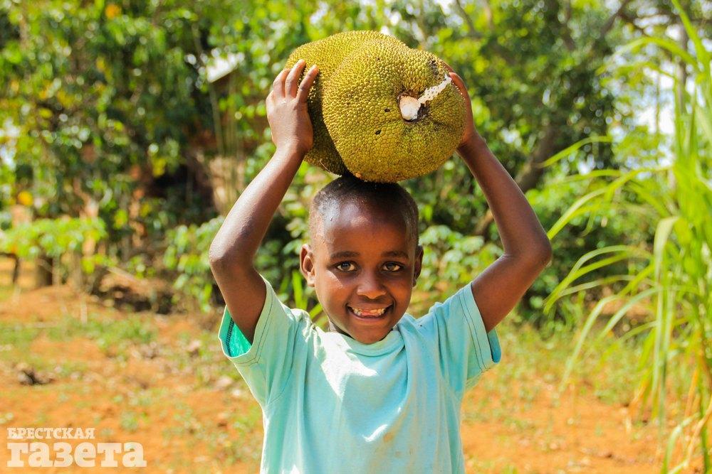 Этот угандийский малыш держит над головой один из самых больших фруктов в мире — джекфрут. Пока я фотографировала ребенка, его мама принесла мне несколько кусочков, а мальчик принес мыло и тазик с водой, чтобы я смогла помыть руки — фрукт довольно липкий. Мальчик подражает своей маме, носит фрукты в дом на голове, как это делают все угандийские женщины.