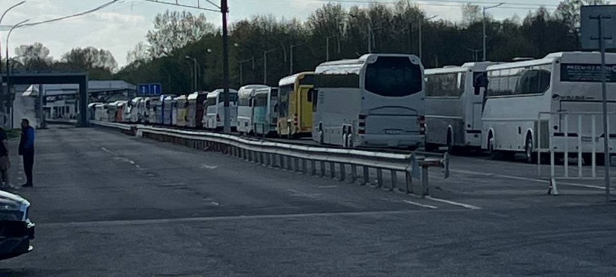 В очереди перед пунктом пропуска «Брест» частично стоят пустые автобусы