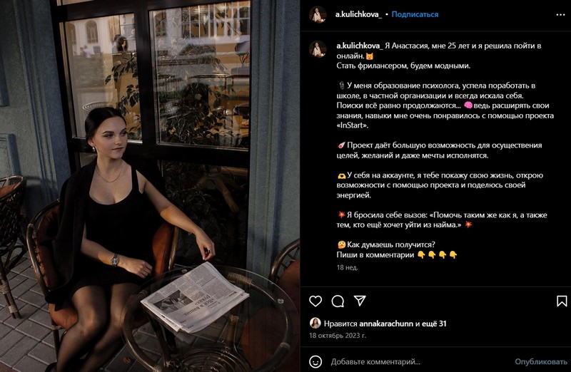 Журналисты BGmedia нашли одну из страниц Анастасии Куличковой в Instagram. В описании профиля указано, что она работает куратором InStart, совмещает «найм и фриланс», знает, «какие онлайн профессии актуальны!» [эта фраза написана с ошибкой], а также обещает, что с ней станешь «финансово независимым».