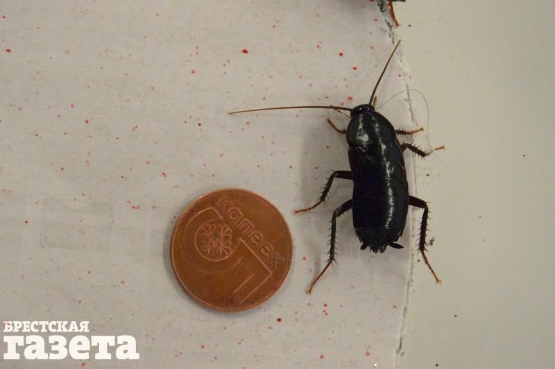Этого таракана, пойманного у себя в подъезде, принес в редакцию «БГ» жилец дома №68 по б-ру Космонавтов. Диаметр 5-копеечной монеты — 2 см. Усатые оккупанты больше такой монеты и выглядят устрашающе. По словам сотрудников санитарной службы, это обычные черные тараканы, просто откормленные. Фото: