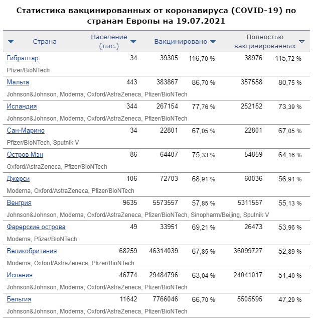 В лидерах по вакцинации в Европе числятся: Гибралтар, Мальта, Исландия, Сан-Марино, Остров Мен. На этих территориях вакцинировано более 60% населения. В ряду лидеров Гибралтар стоит особняком. Там вакцинация превысила 100 процентов – 115,72%. Чтобы это значило?