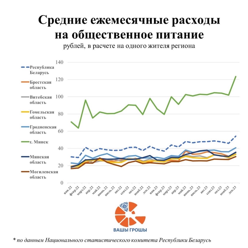 Существеннее всего расходы на общественное питание в минувшем году среди регионов выросли в Брестской области (+13,4%), а меньше всего в Гродненской (+7,9%). В столице рост расходов на общепит составил по итогам 2023 года 10,3%. При этом именно Минск формирует почти половину оборота услуг общественного питания.