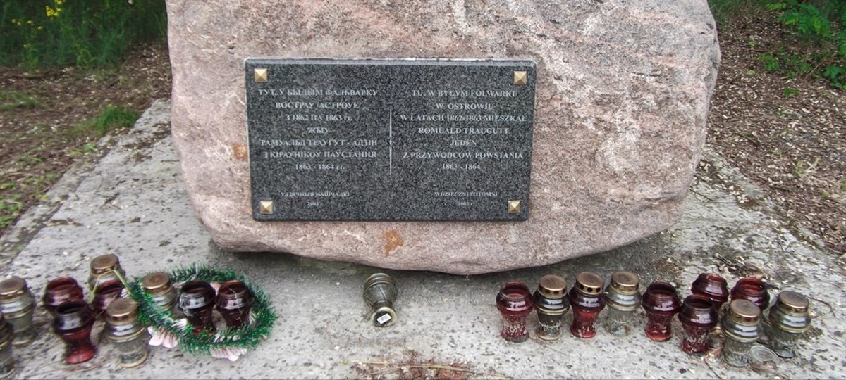 19.10.2023 08:21 Мемориальный знак Ромуальду Траугутту находится в деревне Островье. Надпись на знаке: «Здесь. В бывшем поместье Островье с 1862 по 1863. Жил Ромуальд Траугутт – один из руководителей восстания 1863-1864 гг. Благодарные потомки 2003 г.». Источник фото