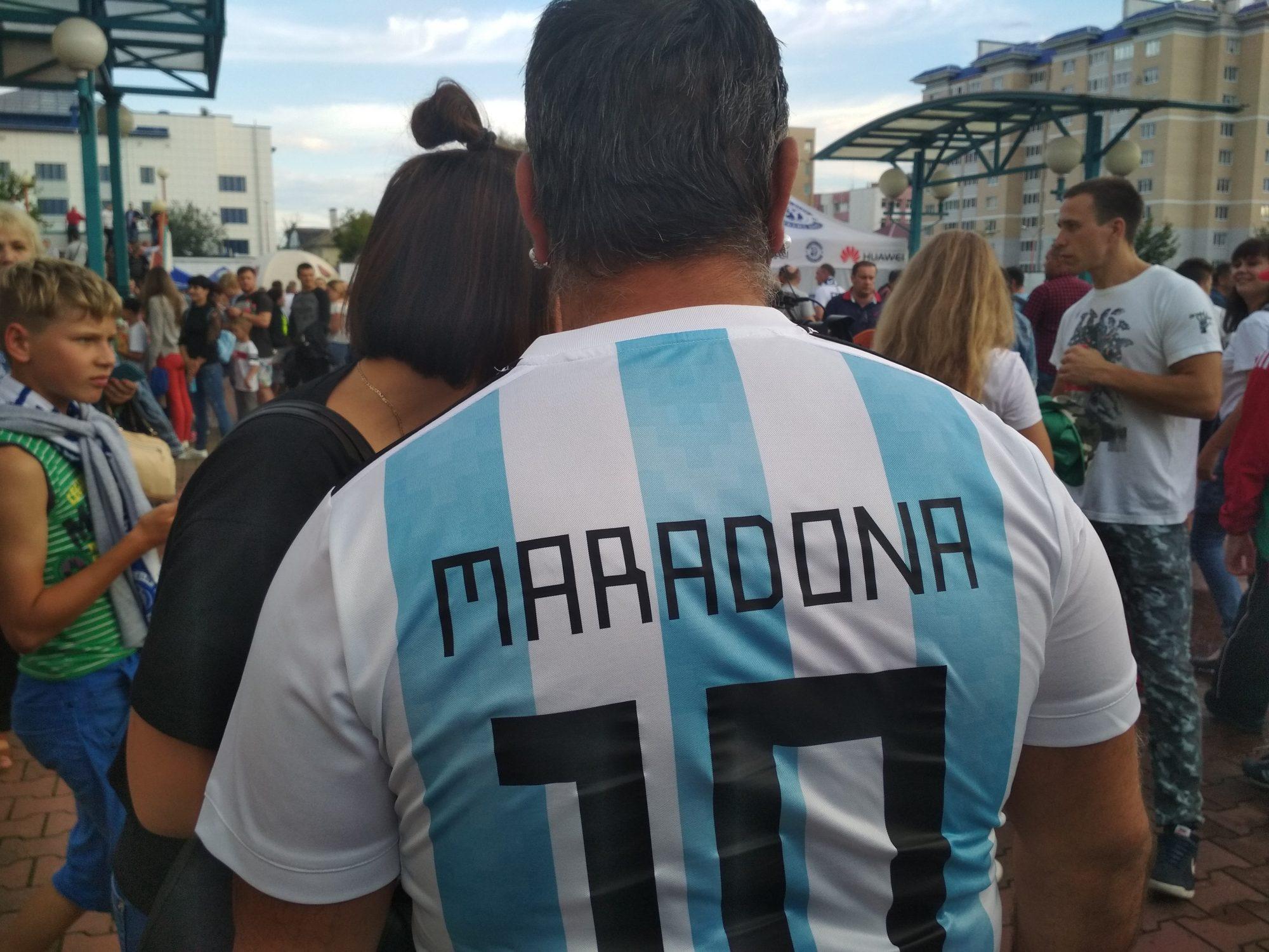 Корреспондент «БГ» выловила десятый номер сборной Аргентины в фотозоне спорткомплекса «Брестский». Здесь вечером 16 июля состоялся знаковый для динамовцев матч. Посмотреть игру хозяев с солигорским «Шахтером» прилетел новый председатель правления клуба легендарный Диего Марадона.